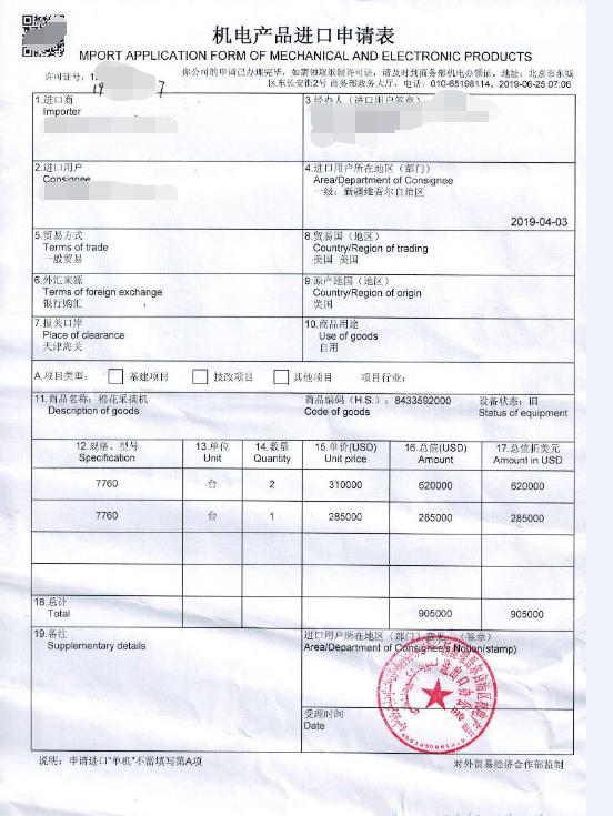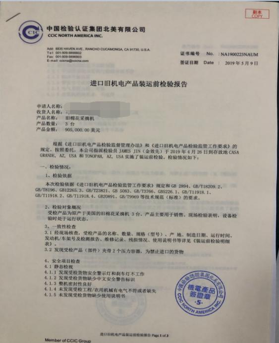 1.二手采棉機(jī)清關(guān)所需材料(購(gòu)買(mǎi)發(fā)票,合同,裝箱單,商檢,普柜貨物對(duì)應(yīng)設(shè)備清單,中檢證(進(jìn)口舊機(jī)電設(shè)備裝運(yùn)前檢驗(yàn)證書(shū)),收貨人公司營(yíng)執(zhí)。機(jī)電產(chǎn)品進(jìn)出口申請(qǐng)表。